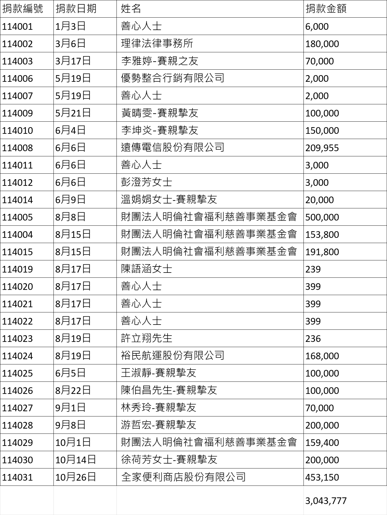 捐款芳名錄114年1月-12月