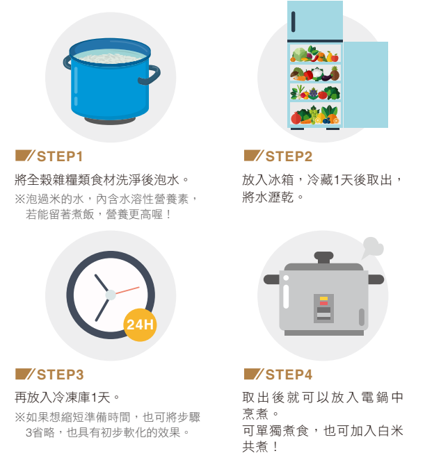 飲食的關鍵不僅是營養均衡,更要「吃得下、吃得久」,只要掌握這些小技巧,就能讓全穀雜糧輕鬆上桌,讓長輩每天都能享受健康、美味又安心的一餐!