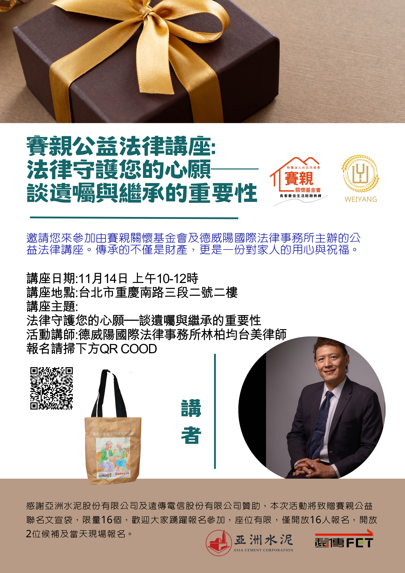 邀請您來參加由賽親關懷基金會及德威陽國際法律事務所主辦的公益法律講座。 傳承的不僅是財產,更是一份對家人的用心與祝福。 講座日期:11月14日 上午10-12時 講座地點:台北市重慶南路三段二號二樓 講座主題:法律守護您的心願──談遺囑與繼承的重要性 活動講師:德威陽國際法律事務所林柏均台美律師 報名請掃下方QR COOD