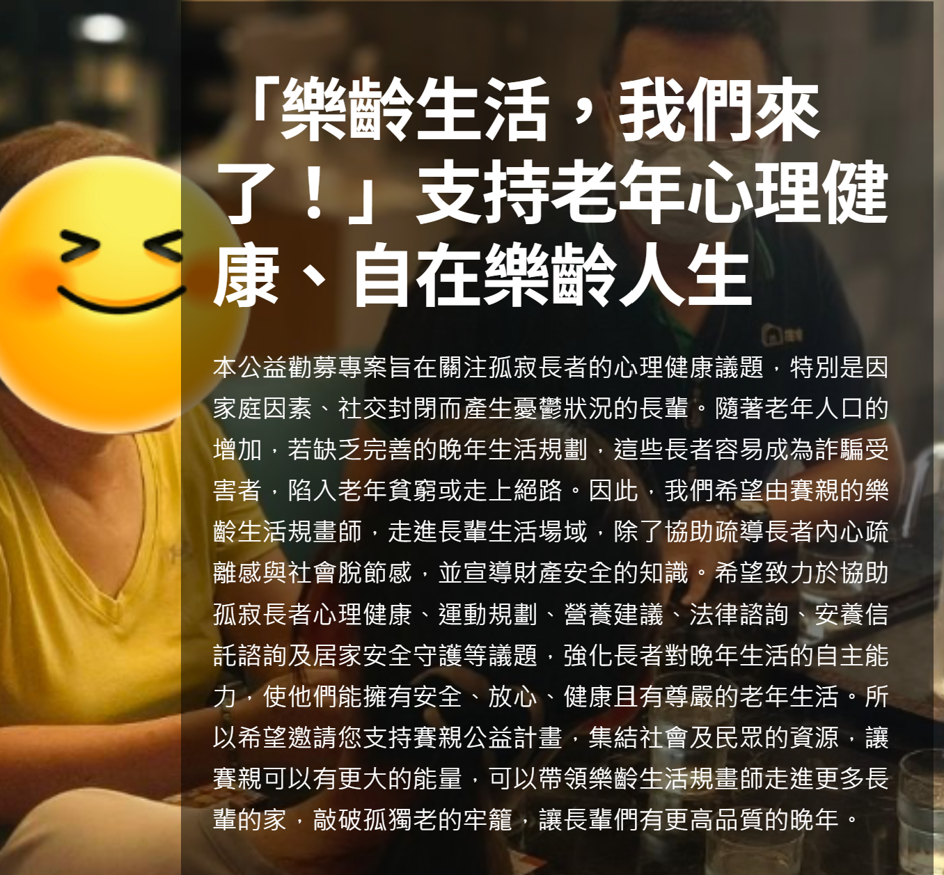 賽親很需要您的支持,您的每一筆捐款,都能化為專業心理支持與溫暖陪伴長者的資源,一起陪長者們繼續黃金歲月的每一步!